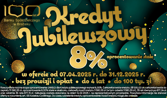 Rzeczywista roczna stopa oprocentowania (RRSO) dla Kredytu jubileuszowego wynosi 8,30%. Całkowita kwota kredytu 28 000,00 zł, całkowita kwota do zapłaty 31 580,55 zł, oprocentowanie 8,00% stałe w skali roku, całkowity koszt kredytu 3 580,55 zł (w tym: odsetki 3 580,55 zł), 35 rat równych po 877,24 zł oraz ostatnia 36 rata 877,15 zł. Kalkulacja została dokonana na dzień 14.02.2025 r. na reprezentatywnym przykładzie. Powyższa informacja nie stanowi oferty w rozumieniu art. 66 Kodeksu Cywilnego. Do czasu udzielenia kredytu oprocentowanie i koszt kredytu mogą ulec zmianie.